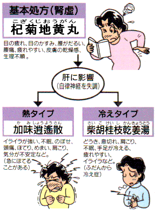 腎に栄養を与える 更年期障害の治療は、大きく2段階に分かれます。 基本処方は、更年期障害の根本的な原因である腎虚を治す「杞菊地黄丸」(こぎくじおうがん)が中心となります。 「杞菊地黄丸」は、目の疲れと目のかすみのほか、生理不順、腰痛、腰のだるさ、疲れやすい、皮膚の乾燥感など腎虚とともに起こる症状がポイントとなります。 更年期障害は女性の老化に伴う一症状と考えられます。 漢方では、人間の成長・発育は腎がコントロールしていると考えています。 杞菊地黄丸は、腎に栄養を与え、その働きを立て直すことで更年期障害を治療します。 腎虚の症状に加え、神経症状が現われてきた場合には、症状に応じて「熱タイブ・冷えタイブ」に分けて治療します。 熱タイプには「加味逍遥散」が適しています。 イライラ感が強く、不眠、頭痛・頭重、めまい、のぼせ、肩こり、気分が不安定、などの症状がポイントです。 いつもイライラして、急にほてってくるような方に適しています。 冷えタイプには「柴胡桂枝乾姜湯」が使われます。 どうき、息切れなどの傾向が強いことが特徴で、不眠やめまい、肩こり、貧血、疲れやすい、イライラ感などの症状を伴います。 ふだんから、冷え症の方に適しています。 症状が落ち着いた場合には、腎虚を治す「杞菊地黄丸」を保健薬として服用することをおすすめします。 それが、老化を防ぎ更年期を健やかに過ごすことにつながります。 |