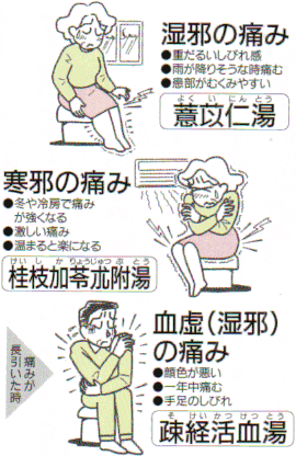 神経痛は六淫の中でも特に風・ 寒・湿に左右されます。風寒湿は 自然界の風、寒さ、湿気に相当する病邪と考えるといいでしょう。 神経痛の原因である風寒湿は、実際には複合して表われますが、処方を選定する場合には、寒のウェ イトが強いのか、湿のウェイトが強いのかをポイントにします。 ●よくい仁湯ワンポイント 「雨が降りそうな時痛みませんか? 体の中の水分代謝が悪いので湿気に反応するのです。 この薬は、水分代謝を良くする働きかありますから、重だるい痛みが楽になります」 ●桂枝加苓朮附湯ワンポイント 「体が冷えると痛みが強くなりませんか?お風呂に入ると痛みが楽になるように、この薬は、体を温めなから痛みを抑えてくれます」 ●疎経活血湯ワンポイント 「痛みが長引くと、体の栄養も悪くなります。この薬は、体の栄養を補いなから痛みを止める働きがあります。慢性化した痛みに最適です |